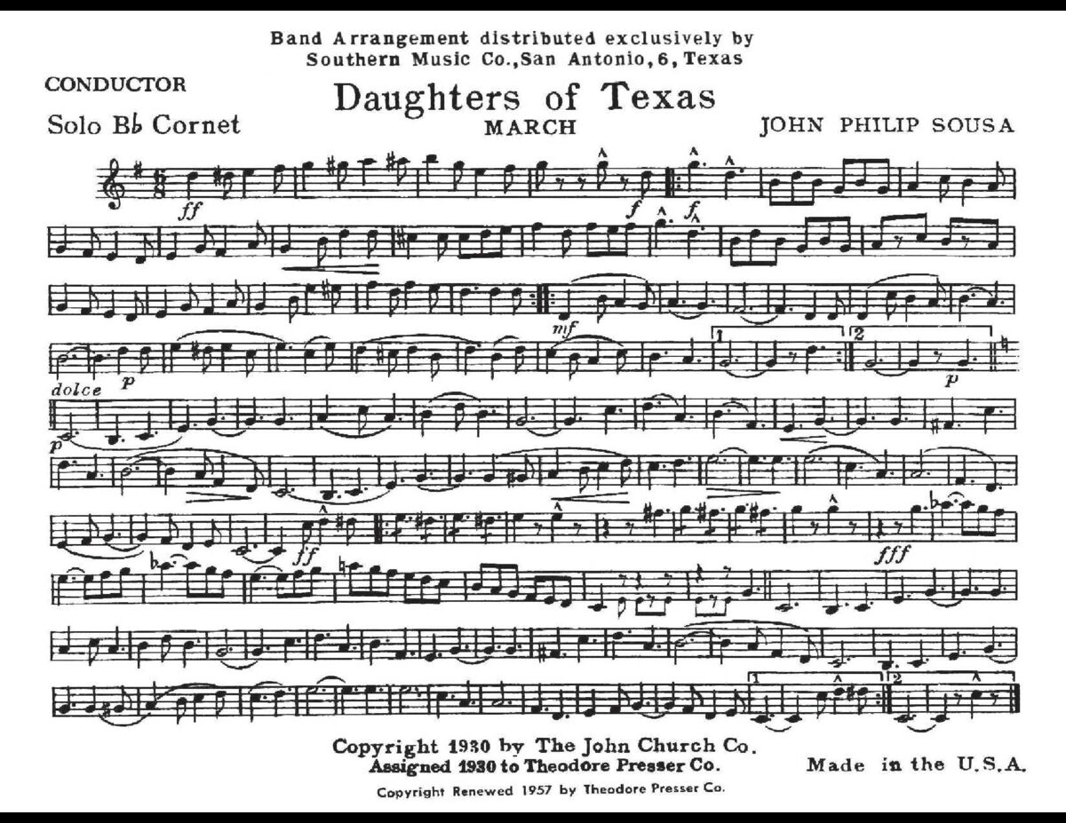 Daughters of TexasMarch composerSousa, John Philiporiginal copyright1930publisherThe John Church Co.; Theodore Presser Co.genreMarchinstrumentationModern instrumentationseekingEUtcchange date2026-03-05 New Post navigation ←Previous post:Americans We→Next post:Dull Razor Blues
