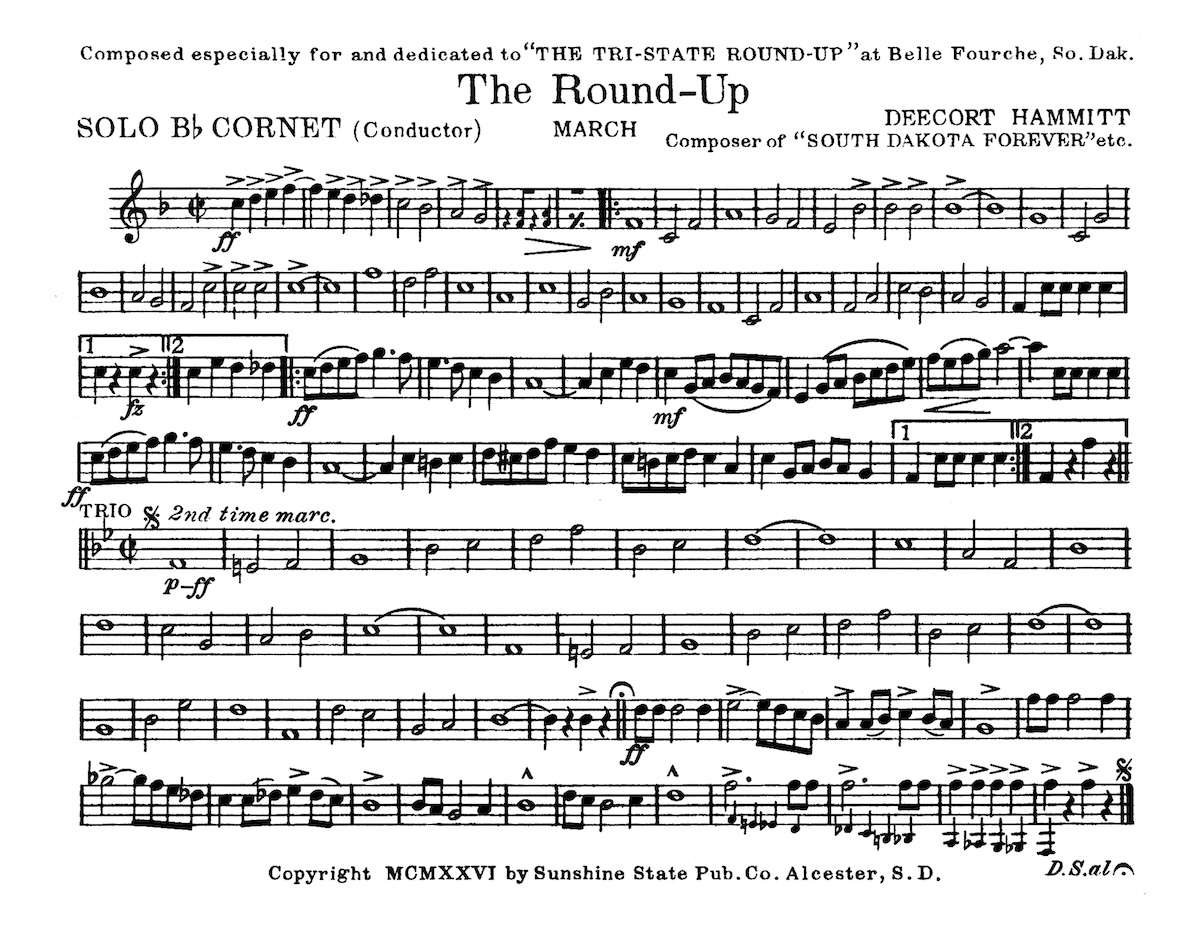 | dedication | Composed especially for and dedicated to "THE TRI-STATE ROUND-UP"at Belle Fourche, So. Dak. |